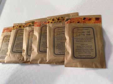 Epsom salts, oatmeal, goat milk blended with lavender dissolve through the filter bag to soak your cares away with no messy clean up.
