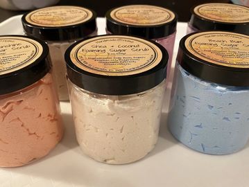 An 8oz container of whipped texture soap with sugar-based scrub for smooth skin.